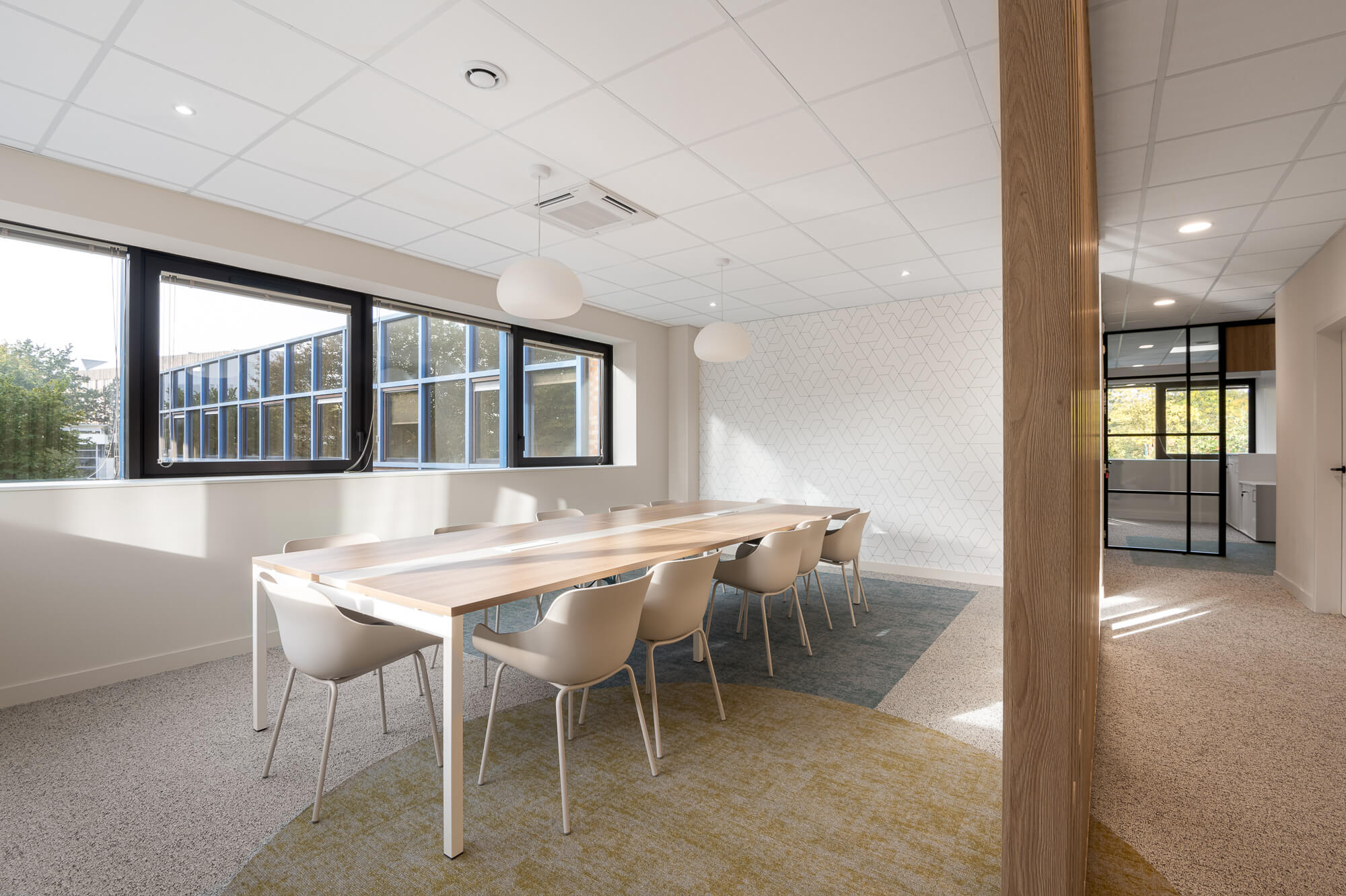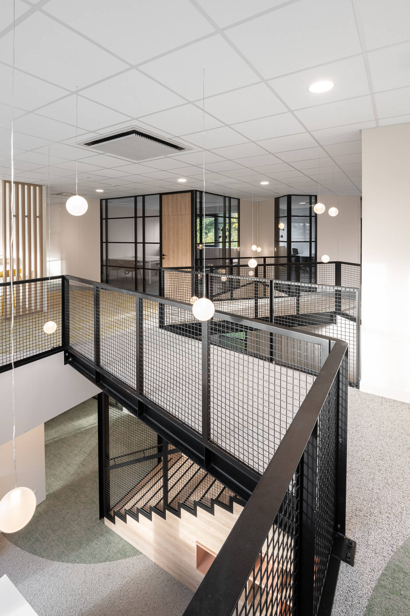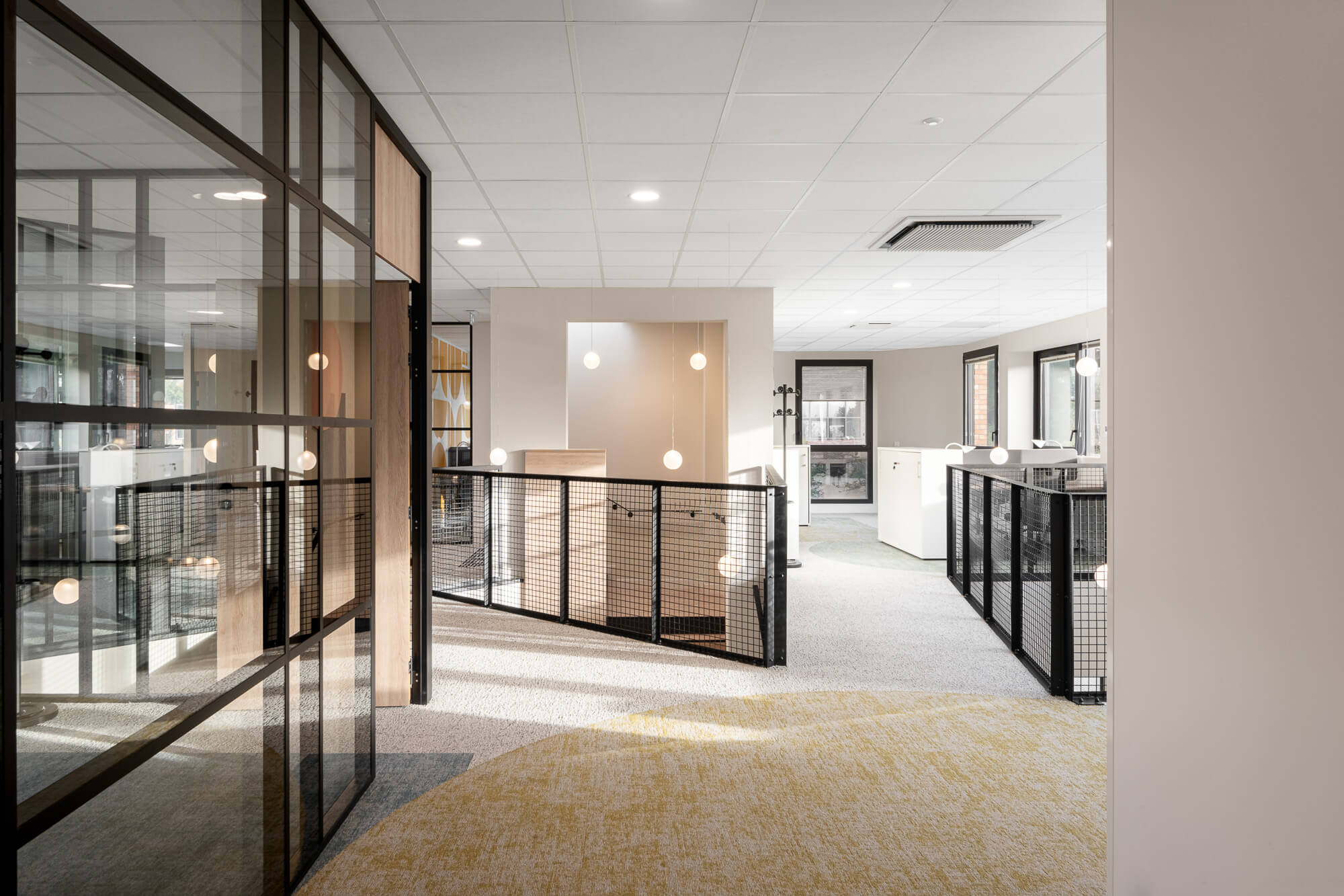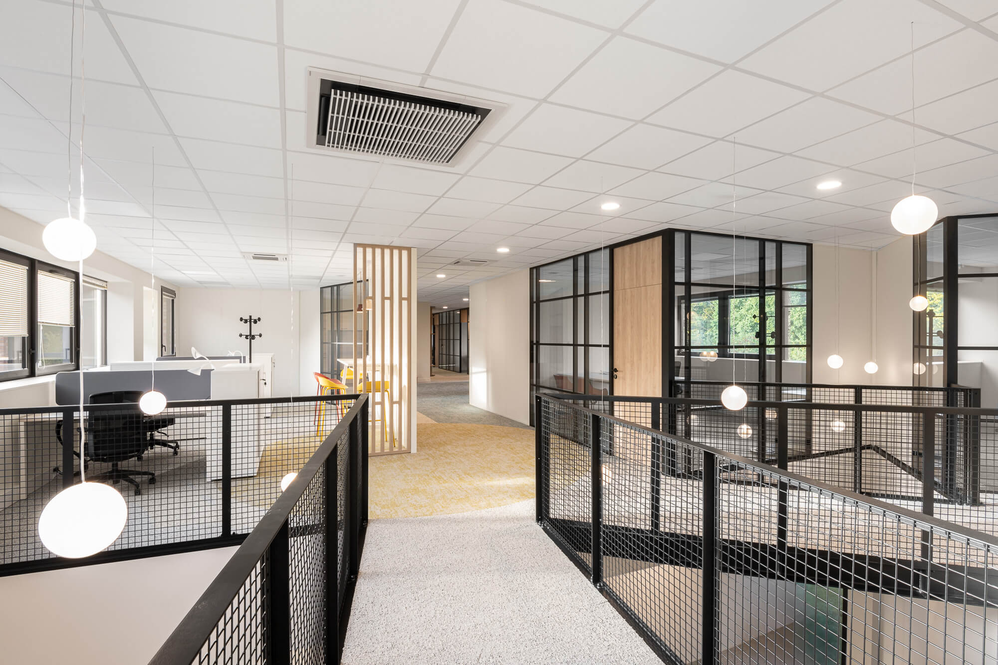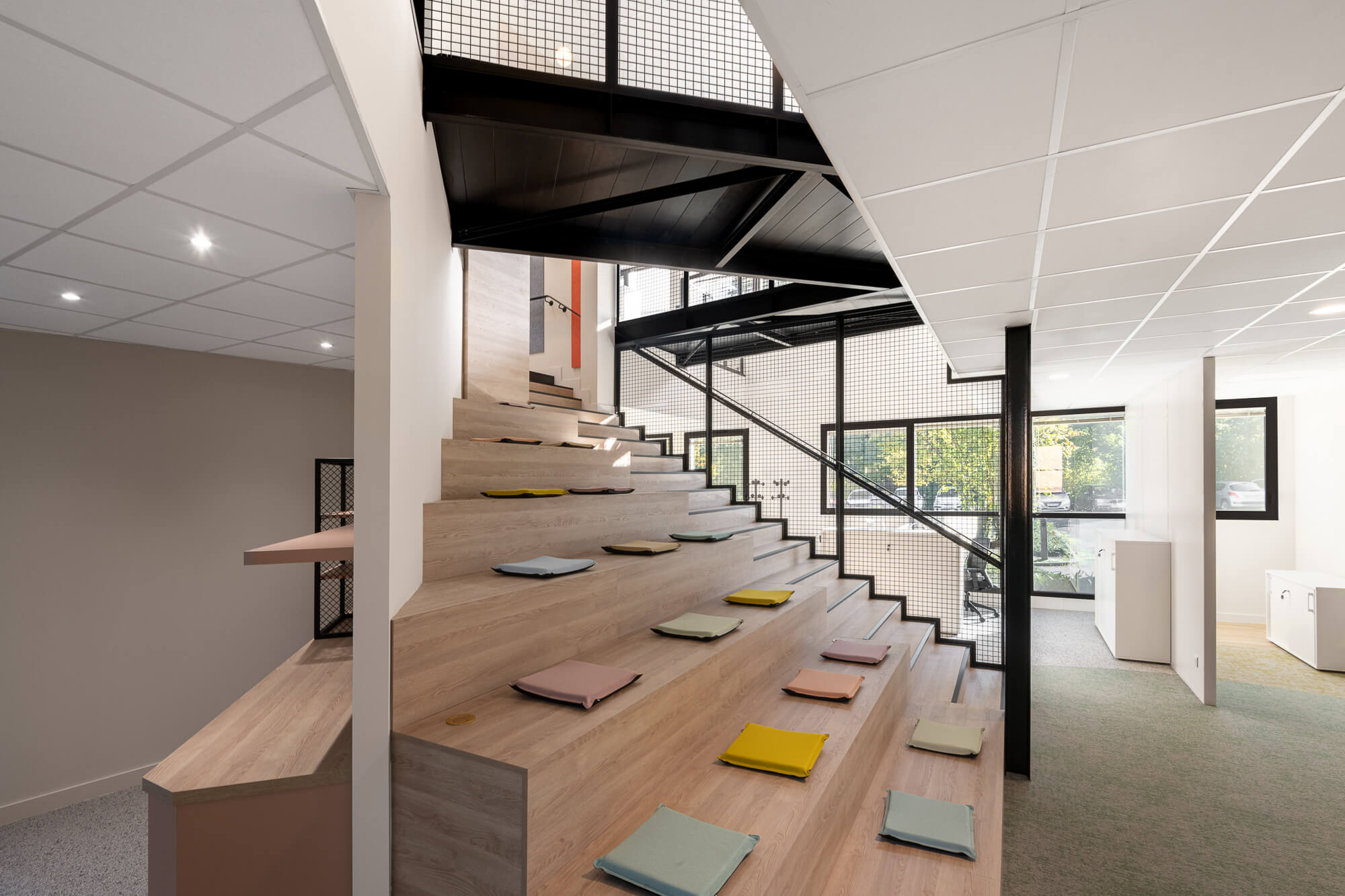 Le projet a abouti à une version définitive où un seul bâtiment a été conservé (le second ayant été vendu – 1000 m²), désormais aménagé en espaces ouverts favorisant la collaboration. Ce nouvel environnement intègre également des salles de réunion partagées et un atrium central, véritable cœur du bâtiment, conçu pour connecter et fluidifier les échanges entre les différents services.