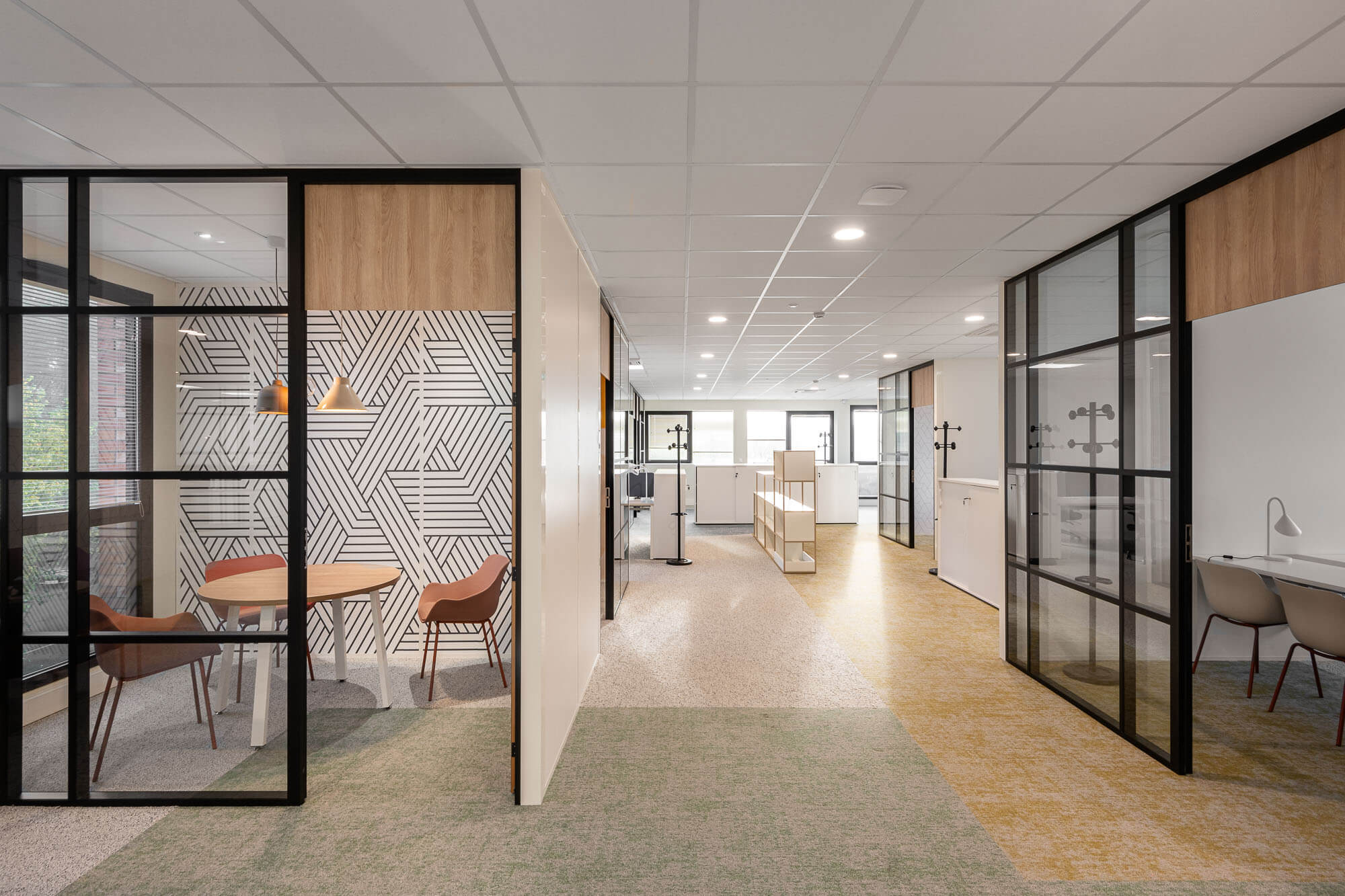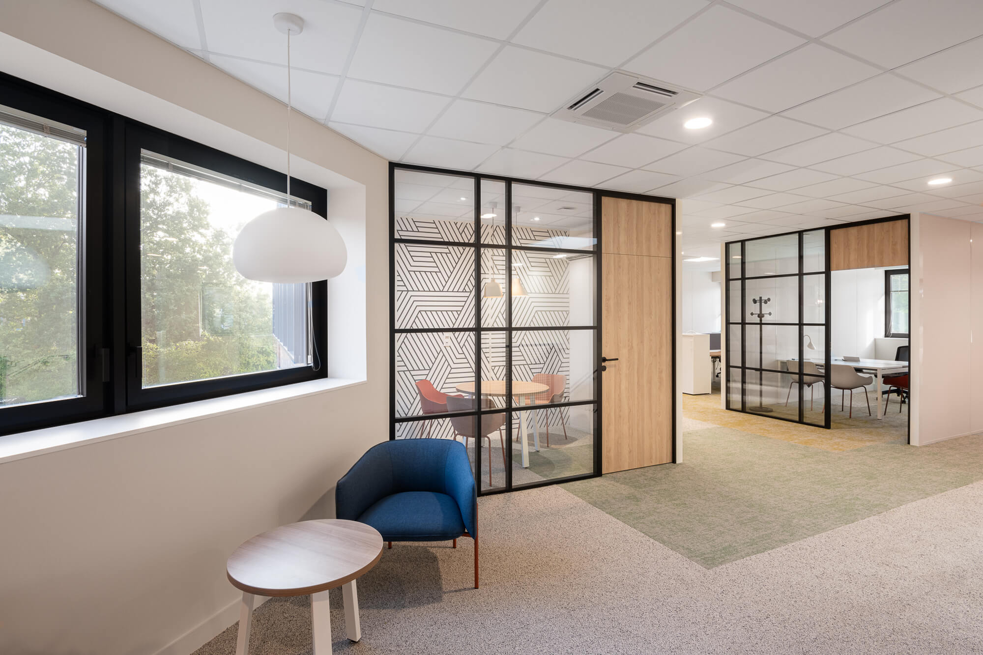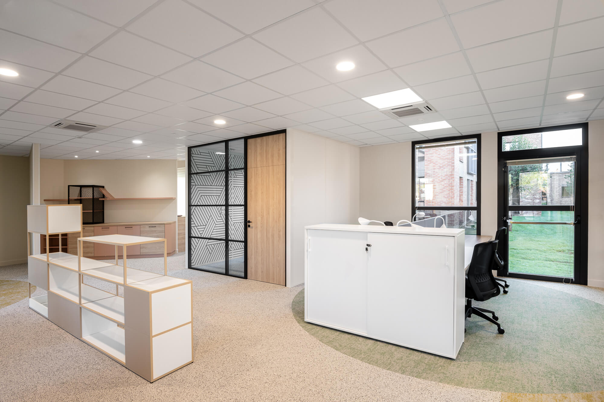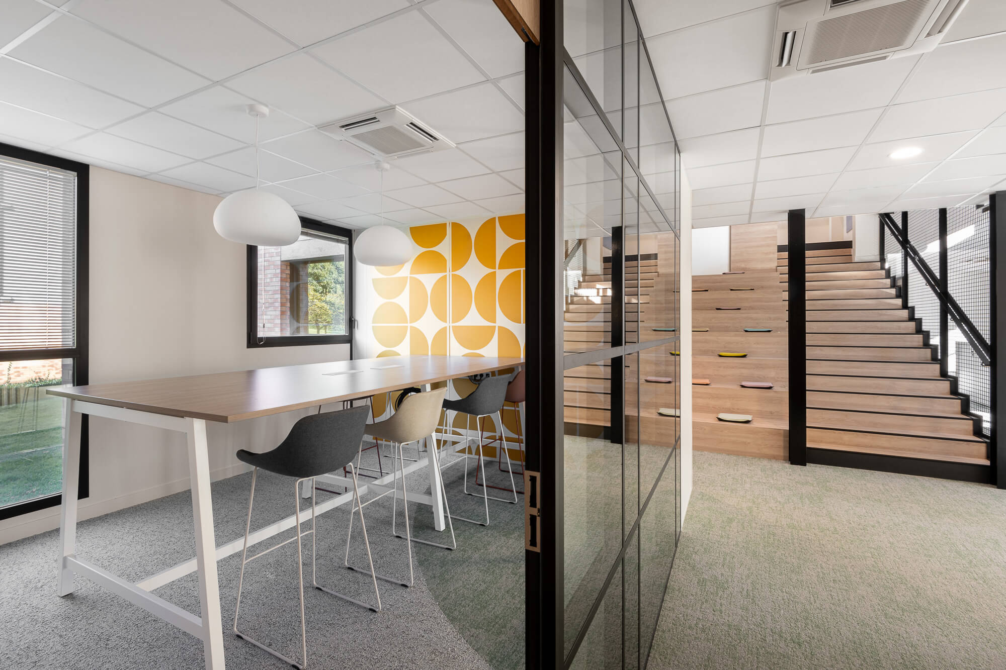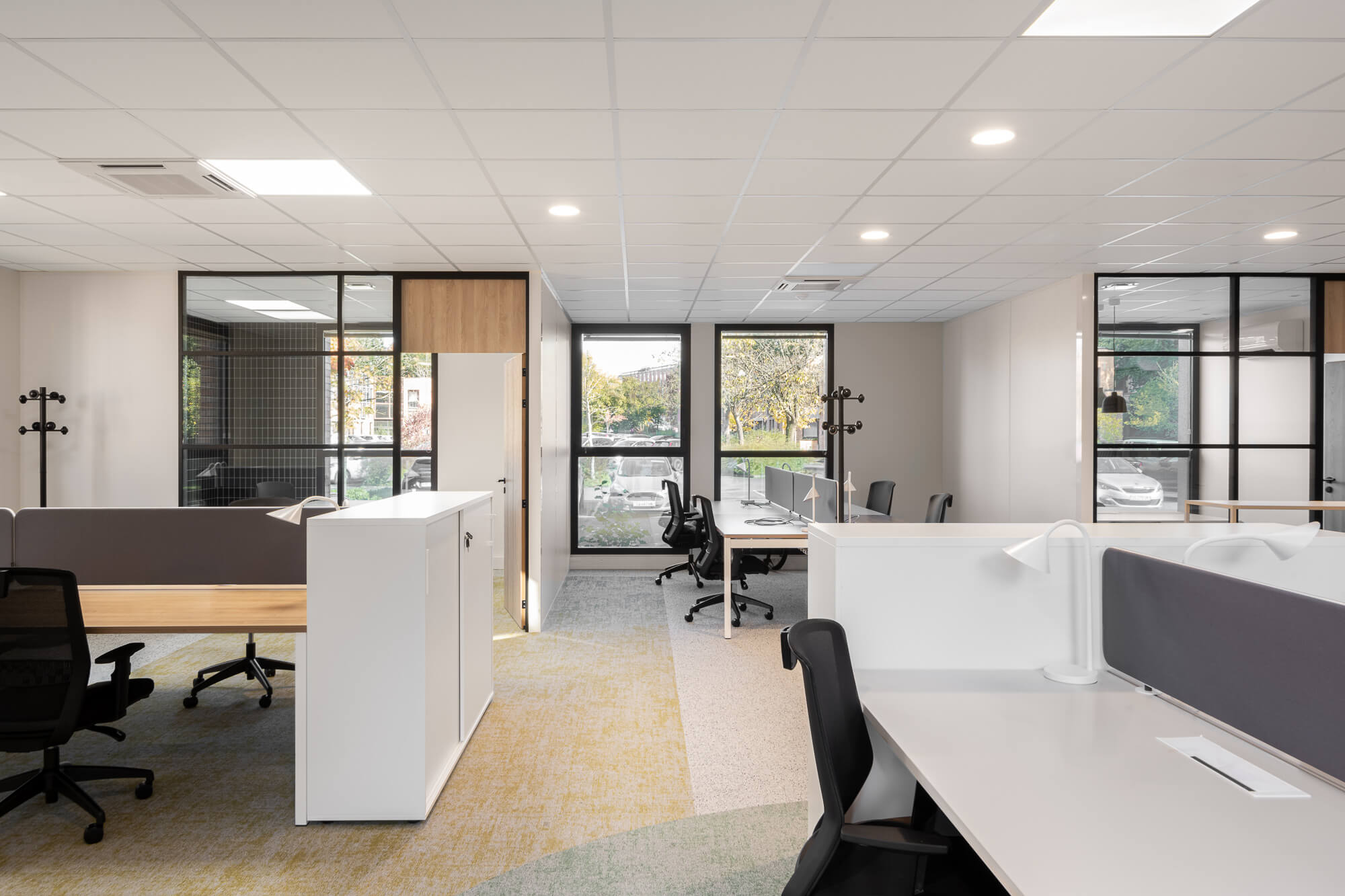 Le projet a abouti à une version définitive où un seul bâtiment a été conservé (le second ayant été vendu – 1000 m²), désormais aménagé en espaces ouverts favorisant la collaboration. Ce nouvel environnement intègre également des salles de réunion partagées et un atrium central, véritable cœur du bâtiment, conçu pour connecter et fluidifier les échanges entre les différents services.