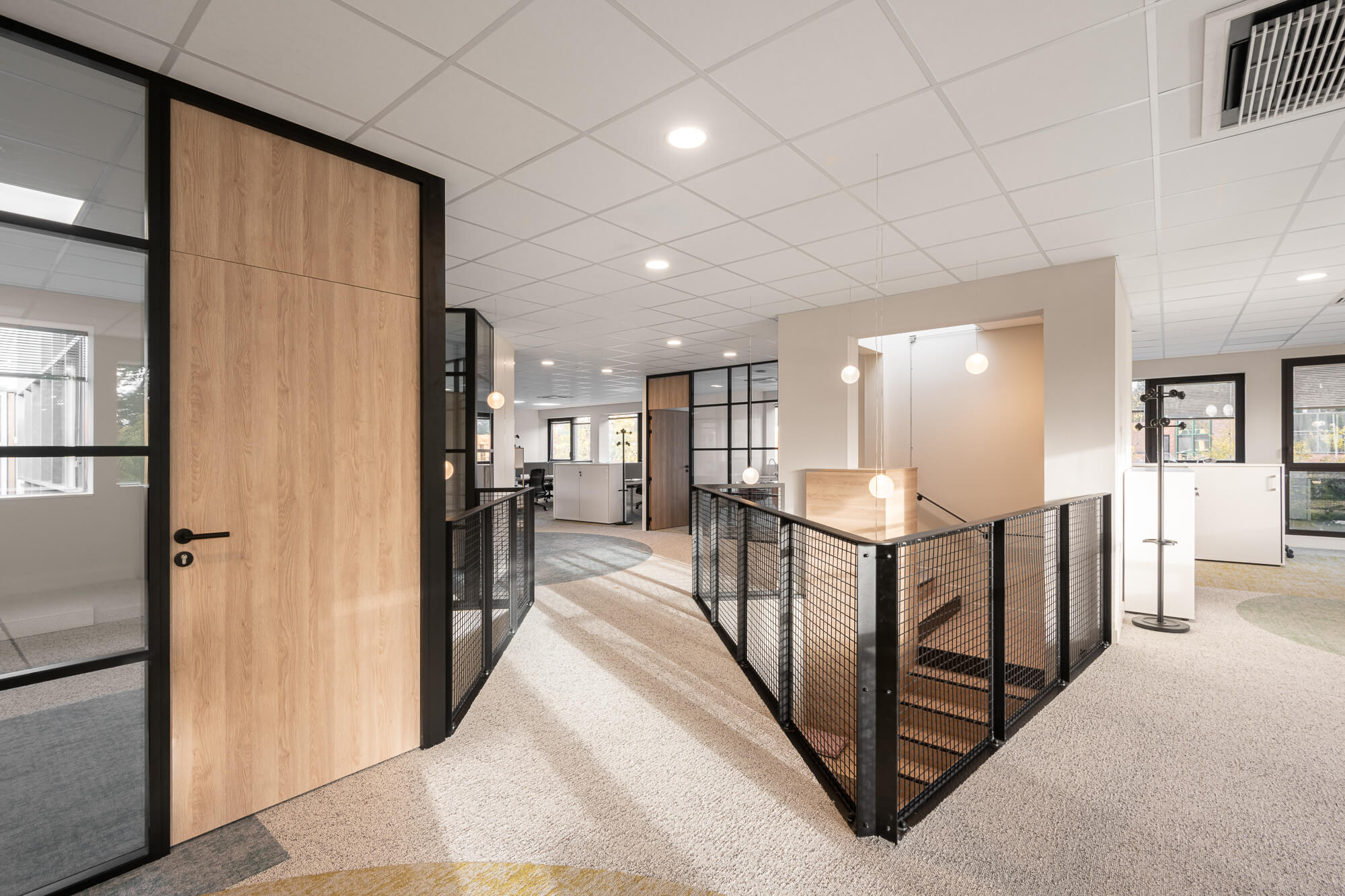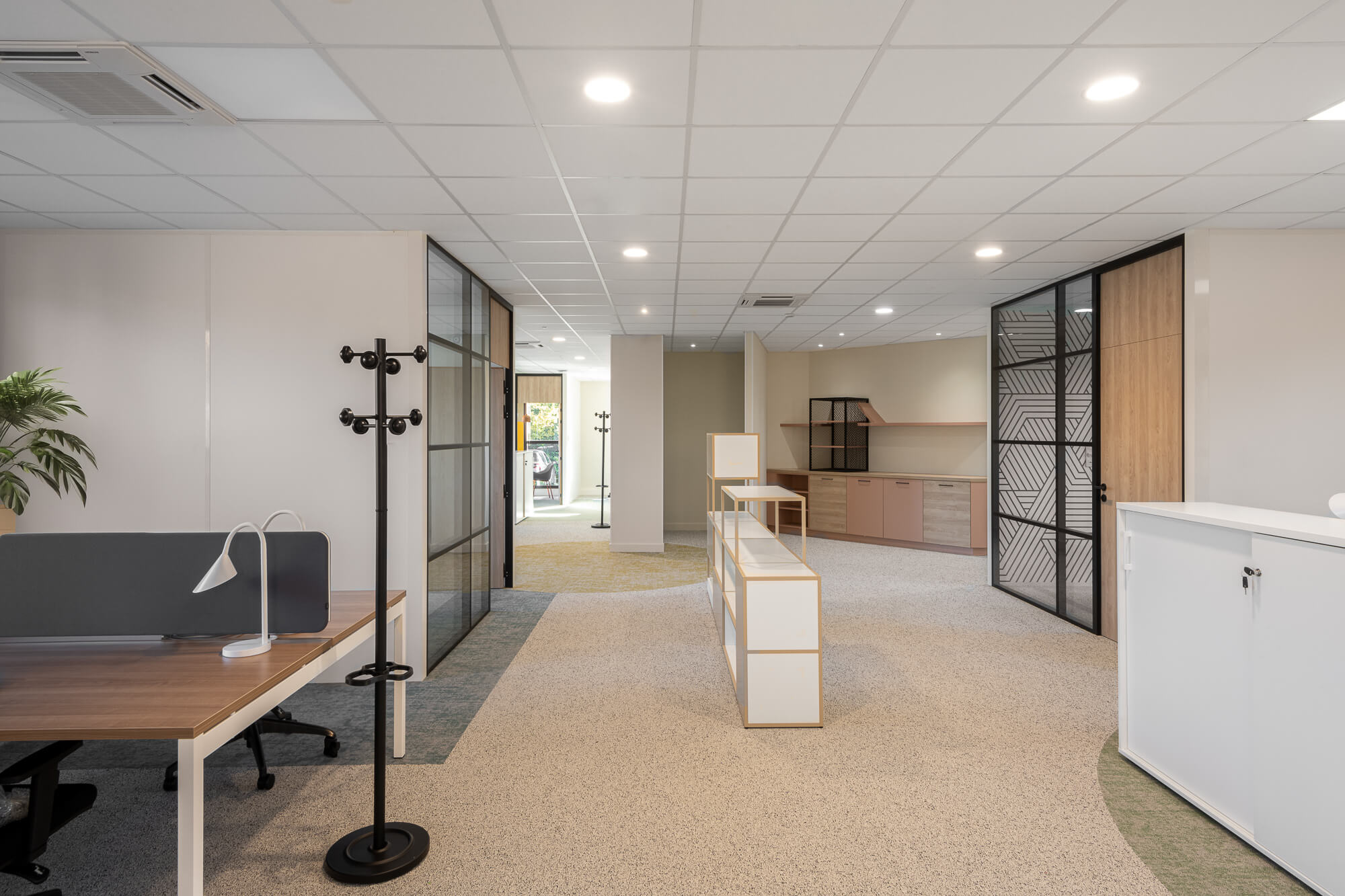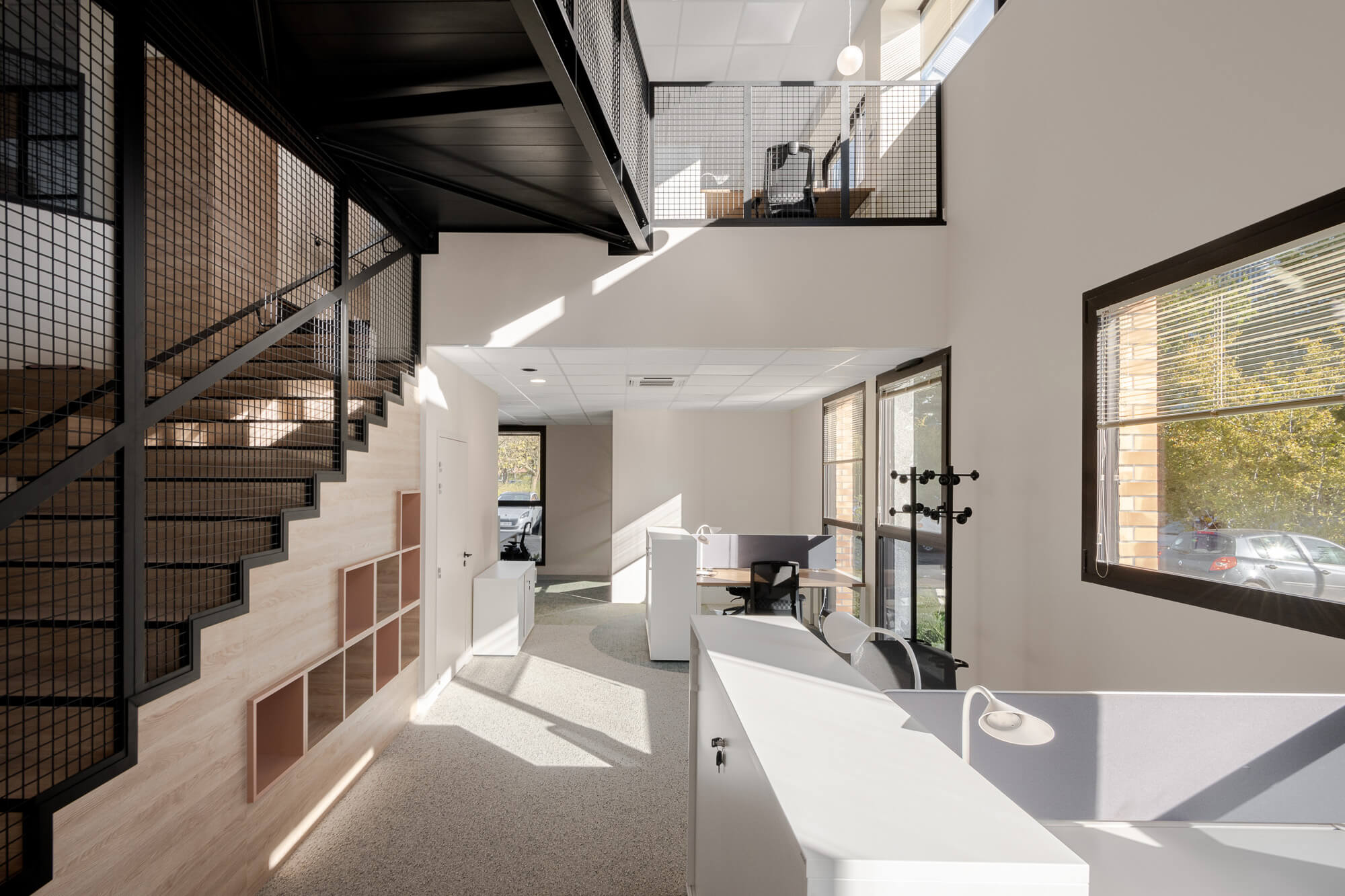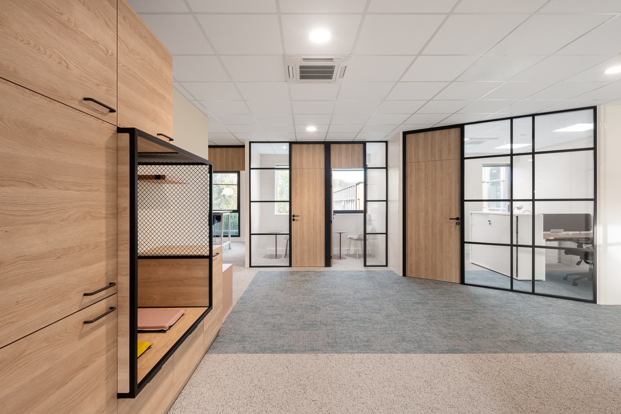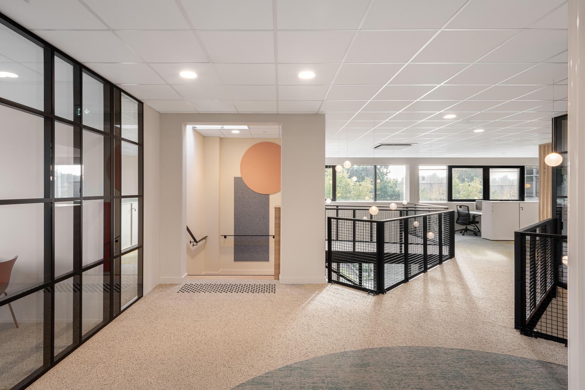 Le projet a abouti à une version définitive où un seul bâtiment a été conservé (le second ayant été vendu – 1000 m²), désormais aménagé en espaces ouverts favorisant la collaboration. Ce nouvel environnement intègre également des salles de réunion partagées et un atrium central, véritable cœur du bâtiment, conçu pour connecter et fluidifier les échanges entre les différents services.
