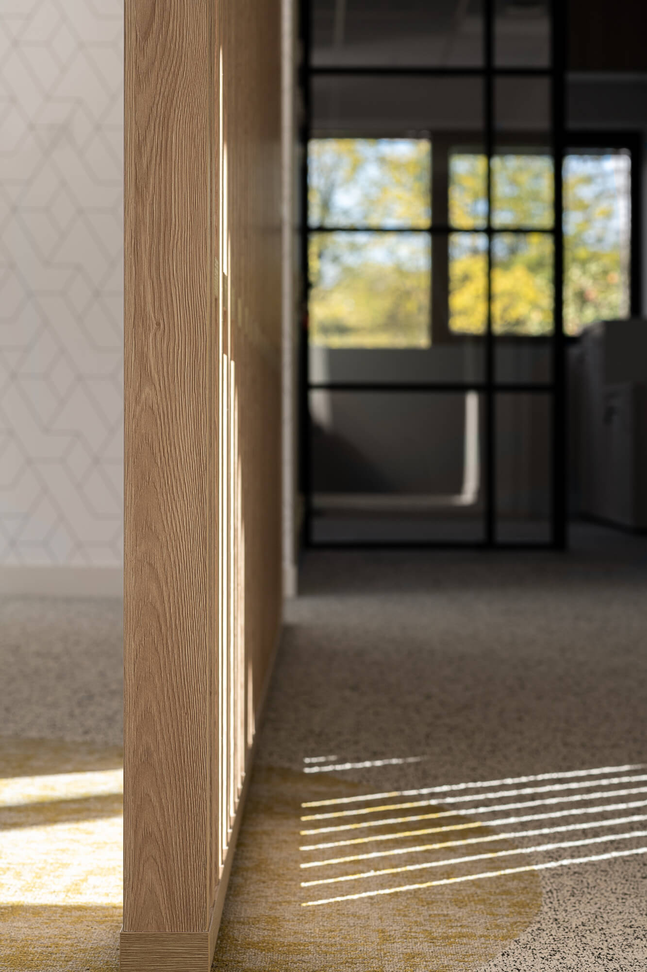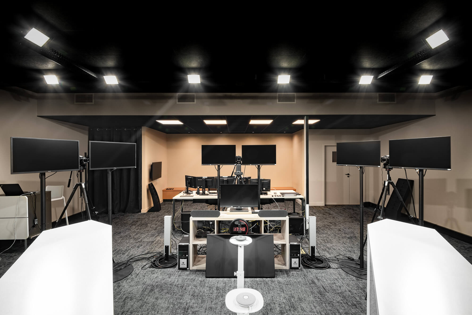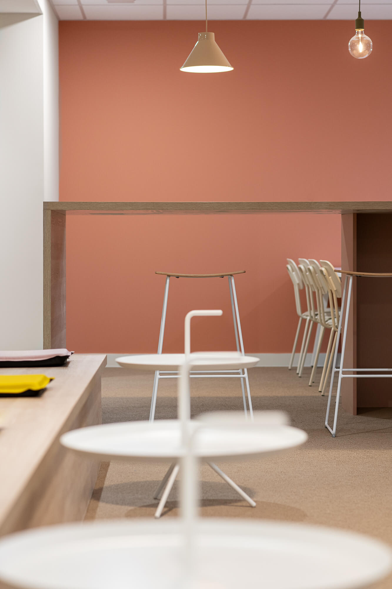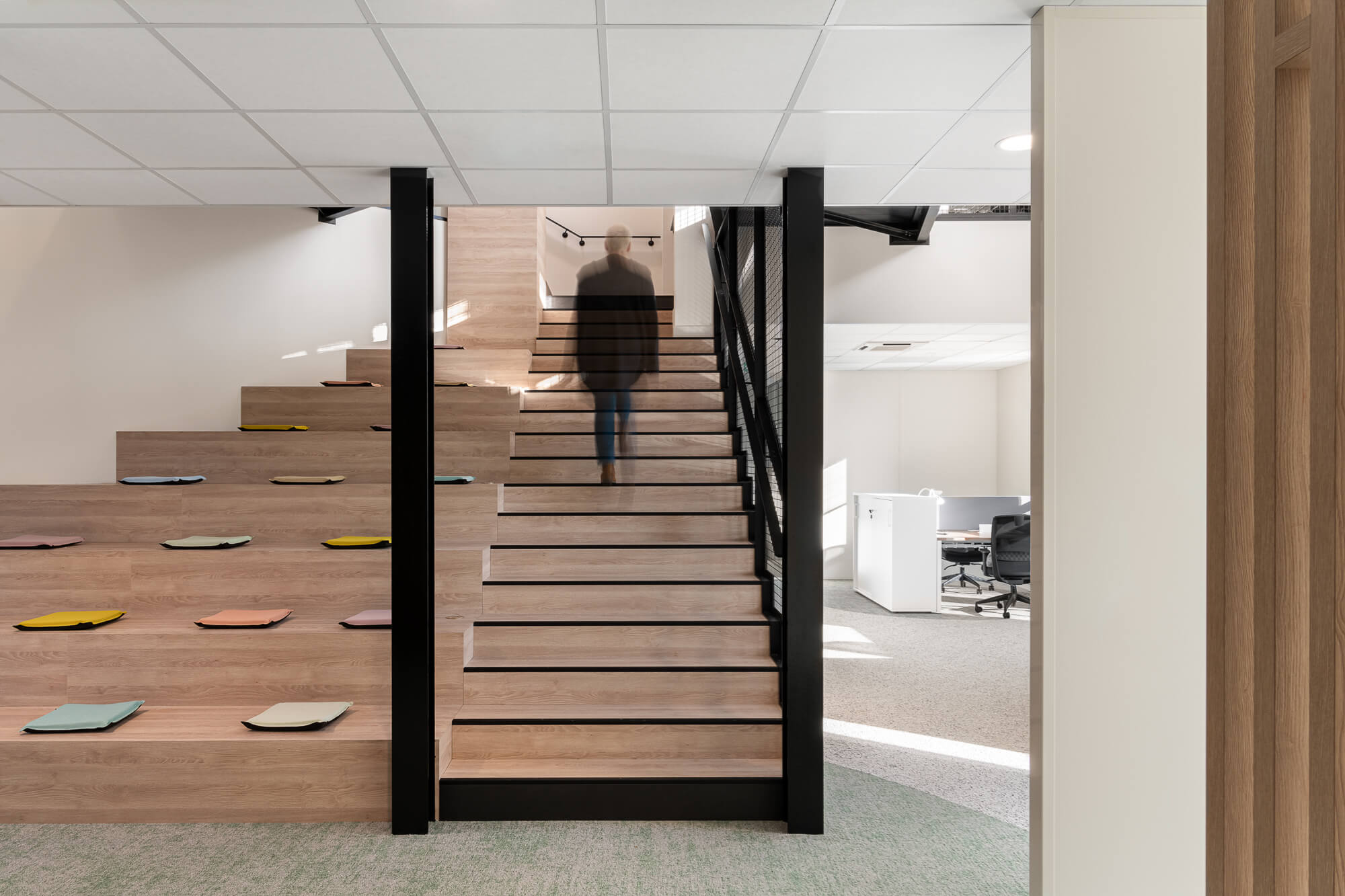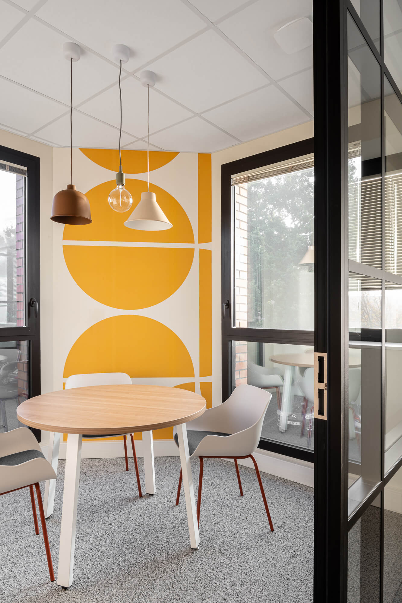 Le projet a abouti à une version définitive où un seul bâtiment a été conservé (le second ayant été vendu – 1000 m²), désormais aménagé en espaces ouverts favorisant la collaboration. Ce nouvel environnement intègre également des salles de réunion partagées et un atrium central, véritable cœur du bâtiment, conçu pour connecter et fluidifier les échanges entre les différents services.